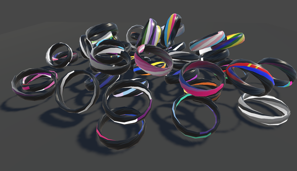 Gradient rings are a VRChat avatar accessory. This package includes an editor to create any color pattern you want on these rings. Pick or generate a ring, put it on your armature, and upload your avatar.